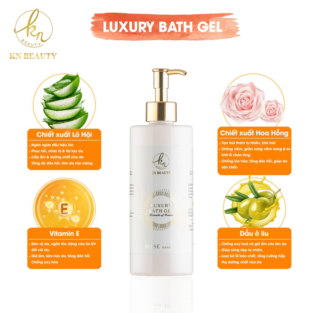 - KN Beauty Luxury Bath Gel Rose essence dùng để tắm toàn thân, làm sạch và chăm sóc cơ thể với tinh dầu nước hoa thơm quyến rũ, cấp ẩm nuôi dưỡng da mềm mịn hồng hào.