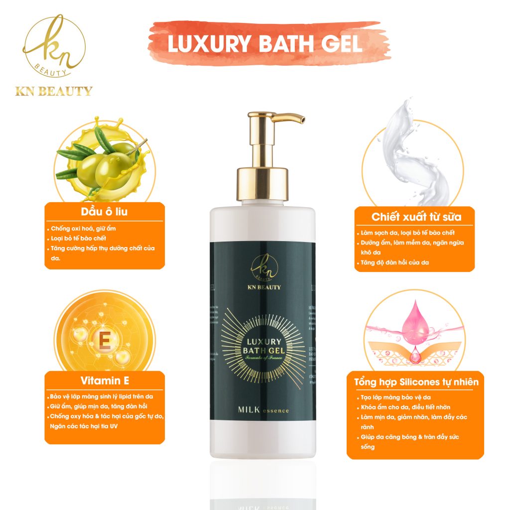 - KN Beauty Luxury Bath Gel Milk essence dùng để tắm toàn thân, làm sạch và chăm sóc cơ thể với tinh dầu hoa thơm quyến rũ, cấp ẩm nuôi dưỡng da mềm mịn hồng hào.