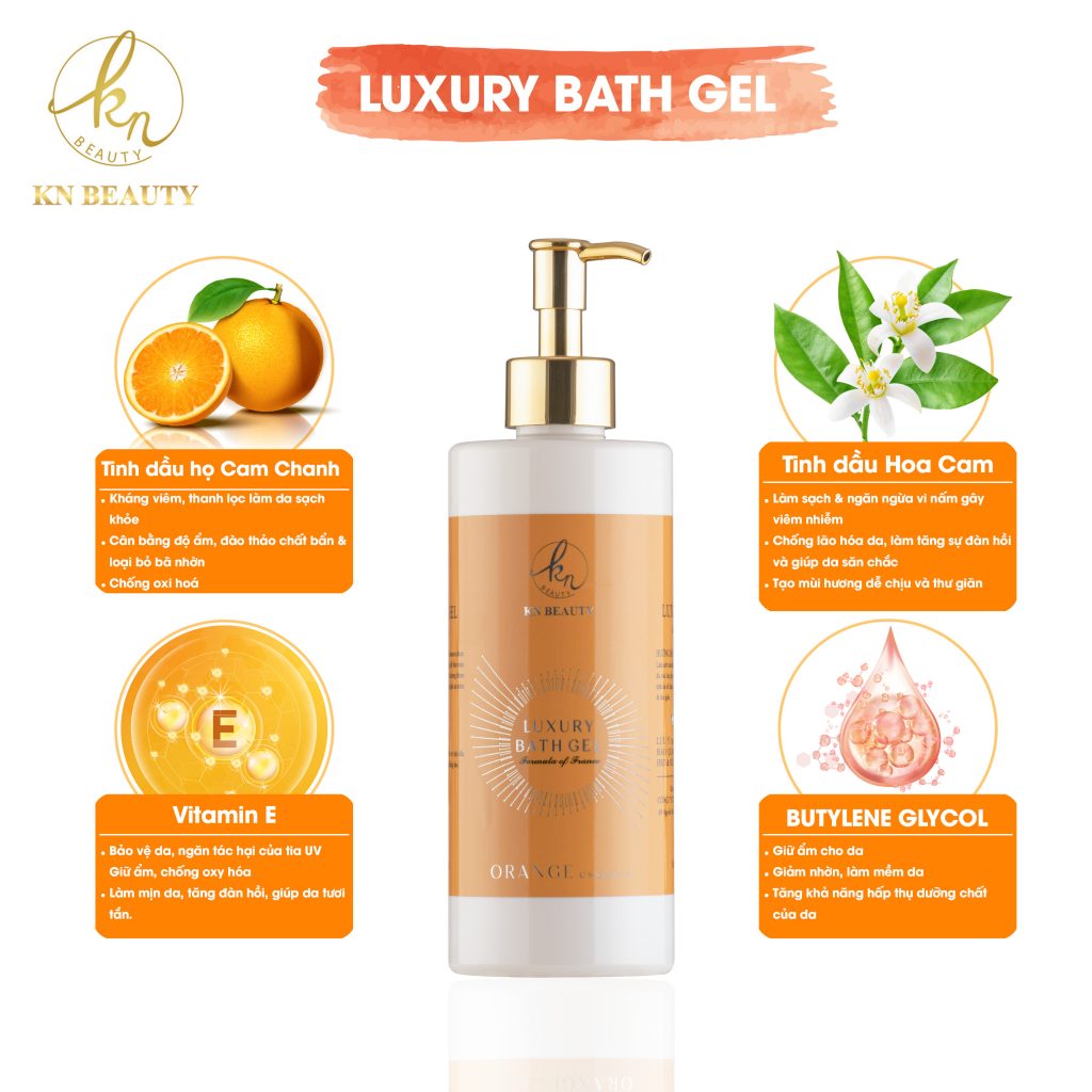 - KN Beauty Luxury Bath Gel Orange essence Dùng để tắm toàn thân, làm sạch & chăm sóc cơ thể với tinh dầu hoa thơm quyến rũ, cấp ẩm nuôi dưỡng da mềm mịn hồng hào.